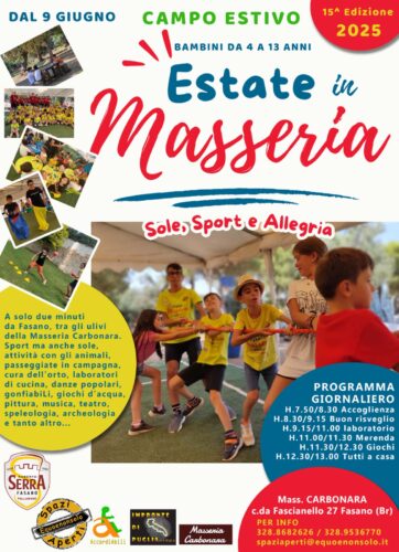 Fervono i preparativi per l’edizione 20256 di “Estate in Masseria”, il centro estivo per bambini da 4 a 12 anni ambientato tra gli ulivi secolari di Masseria Carbonara. Come consuetudine il…