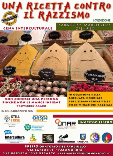 Sabato 29 marzo si è tenuta la X EDIZIONE della cena interculturale “UNA RICETTA CONTRO IL RAZZISMO” presso l’Oratorio del Fanciullo di Fasano.Sul lungo tavolo si è trasferito il mondo,…